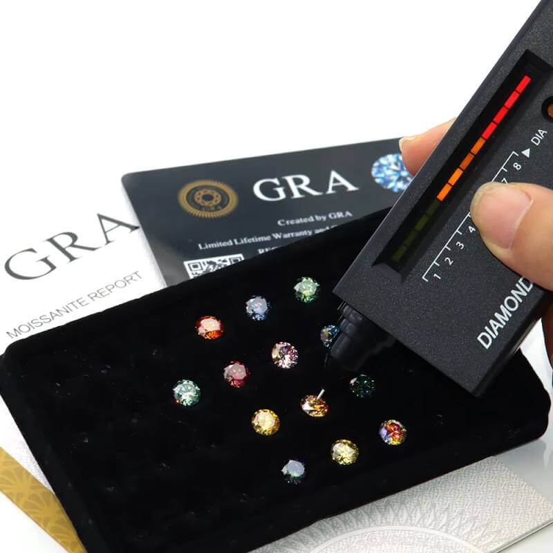 All of our moissanite diamonds are certified by the Global Gemological Research Association (GRA), an independent jewelry institute specializing in the identification of gemstones and jewels.